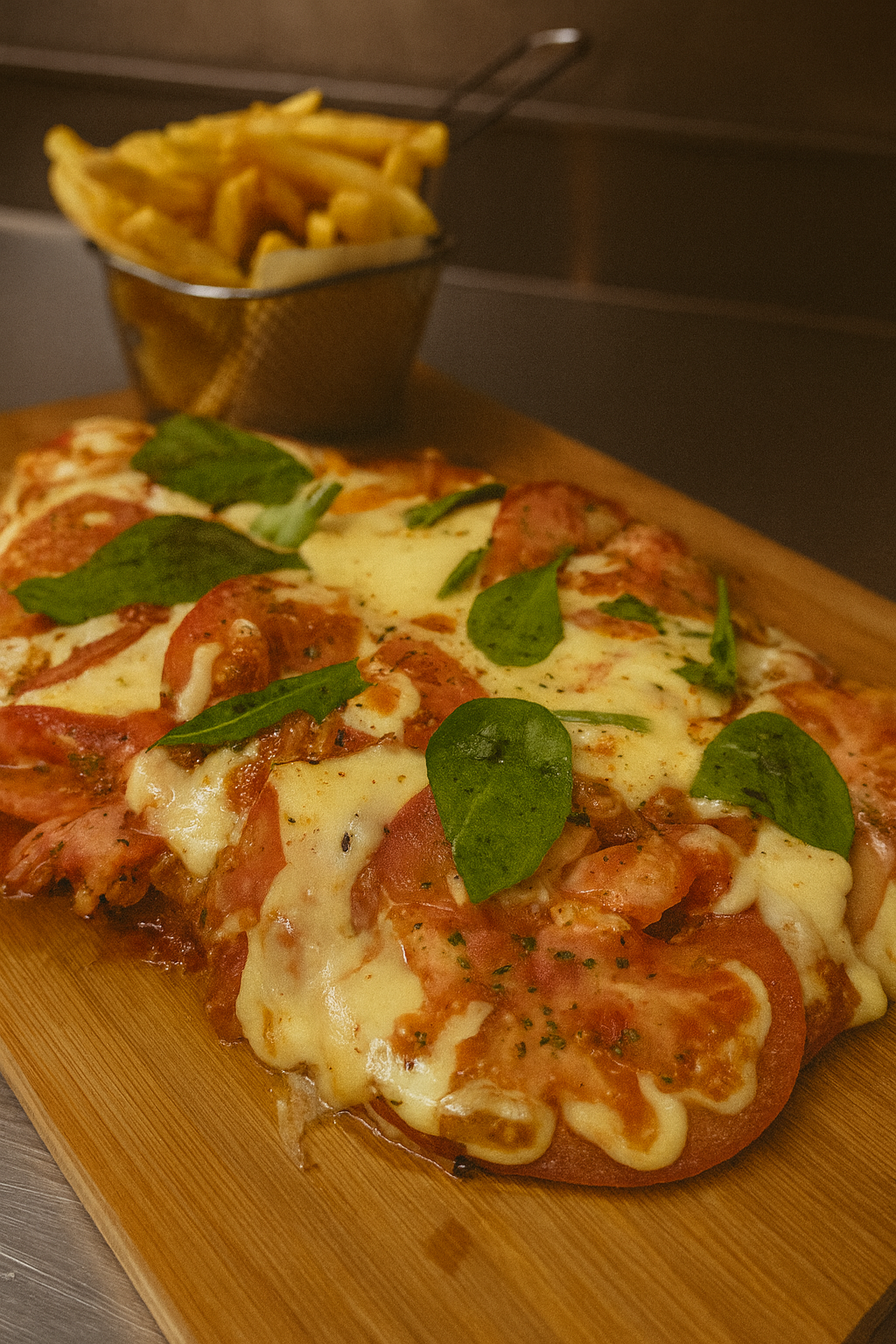 MILANESA DE CARNE AL HORNO CUBIERTA DE SALSA POMODORO, QUESO MOZZARELLA Y TOMATE CON TOQUES DE ORÉGANO, ACEITE DE OLIVA Y RÚCULA. ACOMPAÑADO CON PAPAS FRITAS